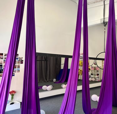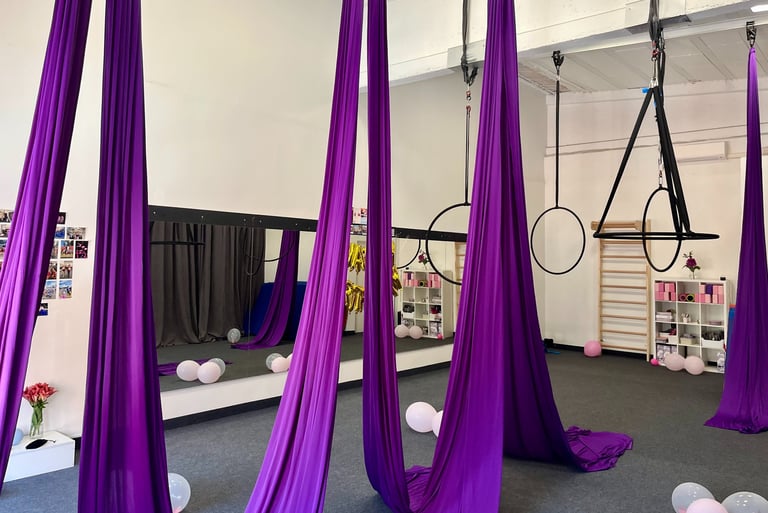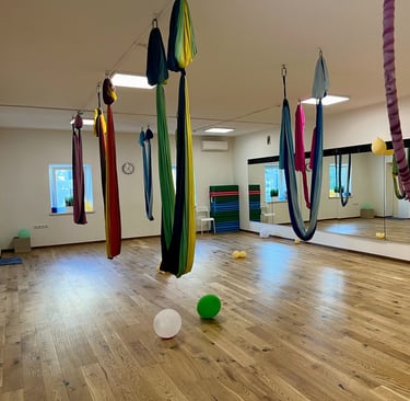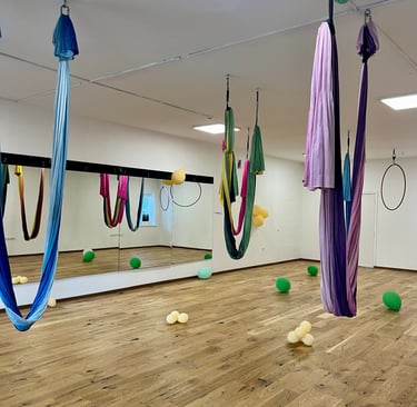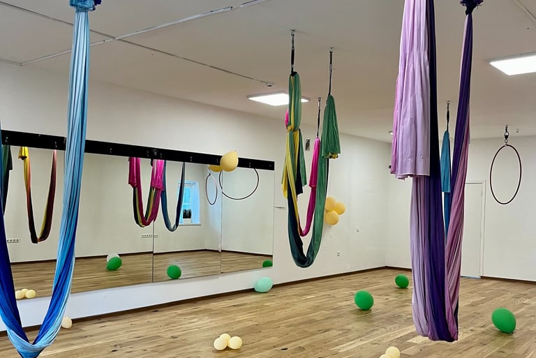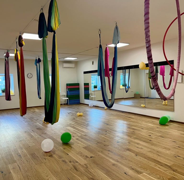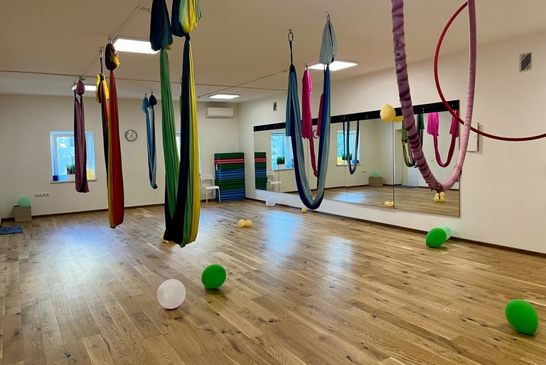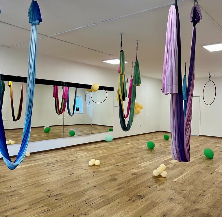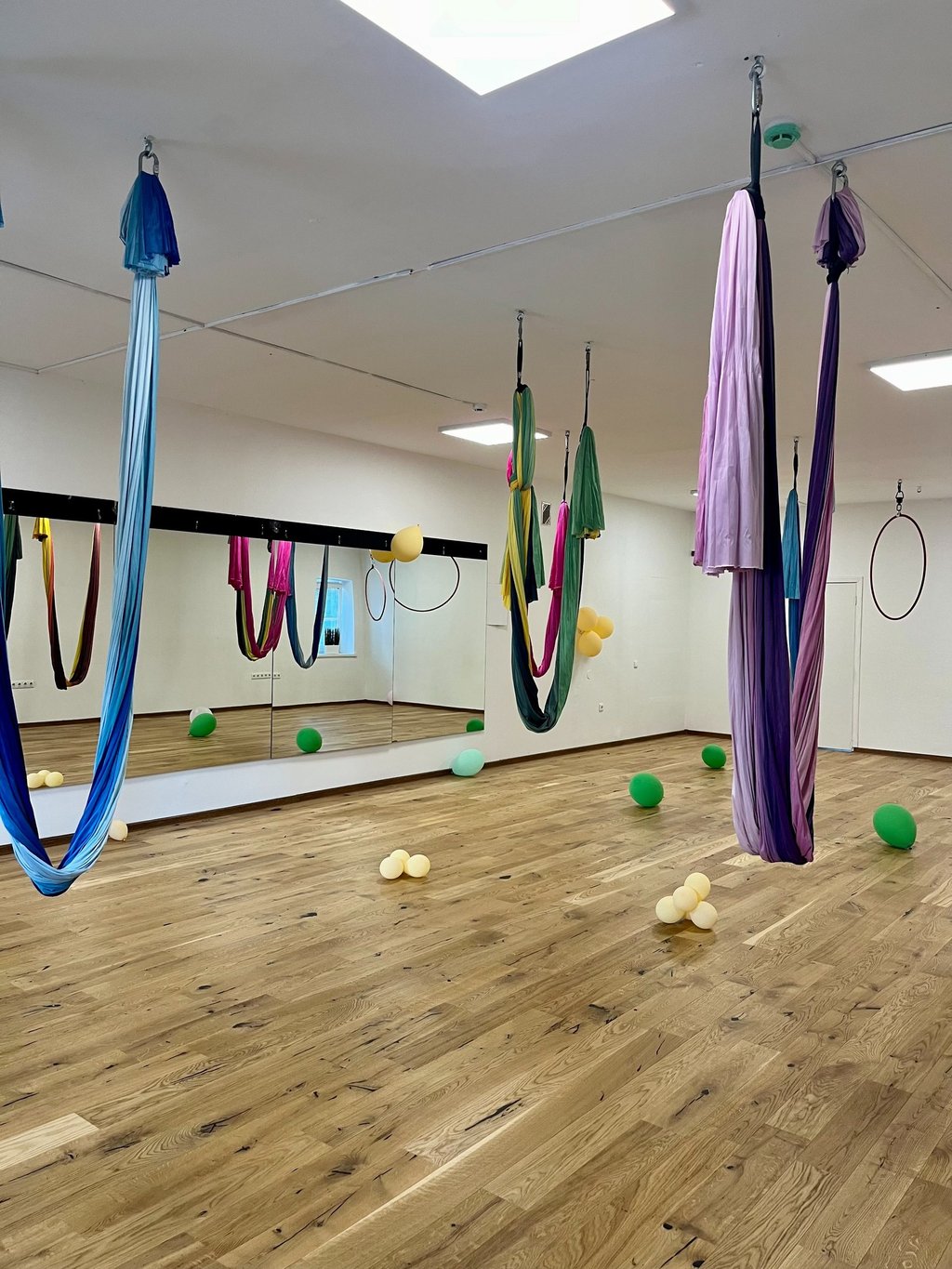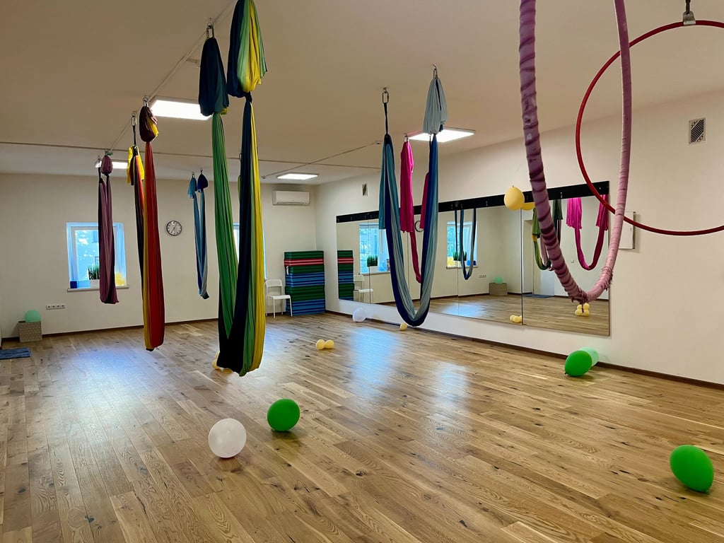 Oro akrobatikos treniruotė su pasirinktu įrankiu - juosta, lankas, hamakas.